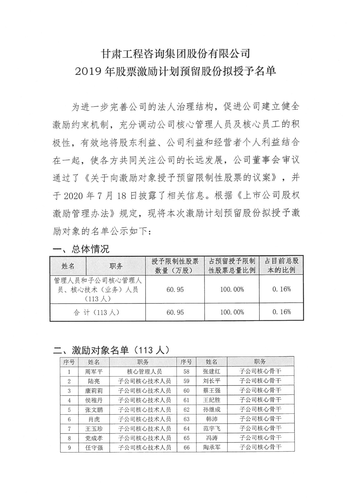 甘肅工程咨詢集團股份有限公司2019年股票激勵計劃預留股份擬授予名單